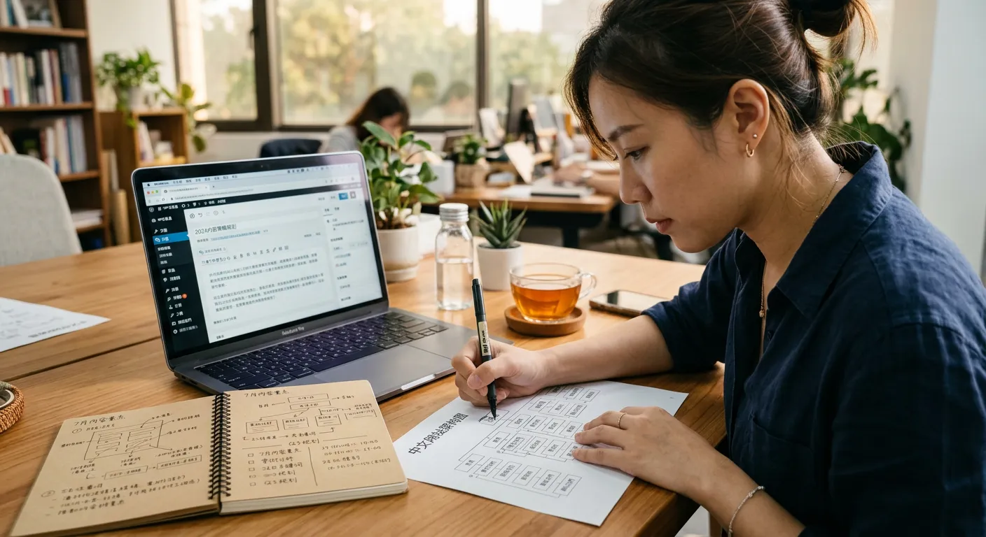Avant que quiconque dans notre équipe n'écrive un seul caractère, nous devons cerner ce qui va fonctionner. Cela passe d'abord par la recherche de mots-clés, et non par la traduction de votre liste anglaise en chinois. Les internautes chinois cherchent avec leurs propres formulations, leur argot, leurs raccourcis. La moitié du temps, les termes les plus rentables n'ont tout simplement pas d'équivalent en anglais. Une fois les requêtes identifiées, nous construisons l'architecture de contenu : quelles pages créer, comment les relier entre elles, ce que Baidu attend en termes de structure. Puis nous planifions votre calendrier éditorial autour des temps forts commerciaux en Chine. Tout le monde connaît le Nouvel An chinois, mais le Singles' Day, le festival 618, la Mi-Automne, la Semaine dorée... ce sont les moments où le trafic explose. Mieux vaut avoir du contenu prêt avant l'ouverture de ces fenêtres, pas après. Nous analysons aussi vos concurrents. Que publient-ils pour le marché chinois ? Où sont les trous dans la raquette ? C'est généralement là que se cachent les meilleures opportunités.