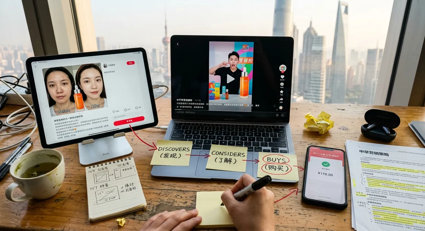A woman scrolls through Xiaohongshu during her lunch break and sees a photo note from someone who looks like her, using a skincare product she’s never heard of. It’s not an ad. It’s a real person showing a before-and-after. She saves the post and moves on with her day. Two weeks later she’s on Douyin and sees the same brand pop up in a short video. A month after that, Singles’ Day arrives and she buys it without thinking twice. She was zhongcao’d weeks ago. The purchase was just the last step.